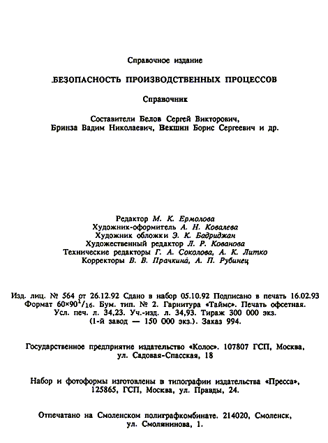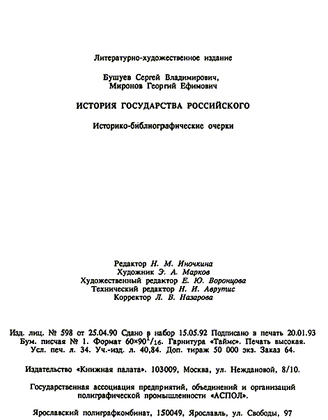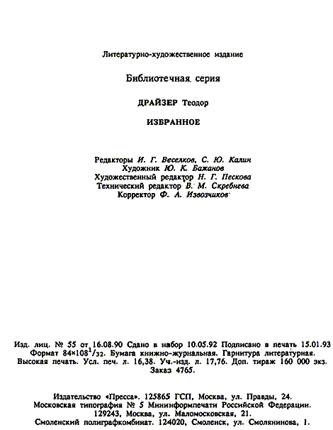 3.3.7 Выпускные данные (см. также разделы 4-7) включают следующие сведения: номер лицензии на издательскую деятельность и дату ее выдачи; дату сдачи в набор и подписания в печать; вид, номер, формат бумаги и долю листа; гарнитуру шрифта основного текста; вид печати; объем издания в условных печатных и учетно-издательских листах; тираж; номер заказа полиграфического предприятия; имя и полный почтовый адрес издателя; название и полный почтовый адрес полиграфического предприятия.