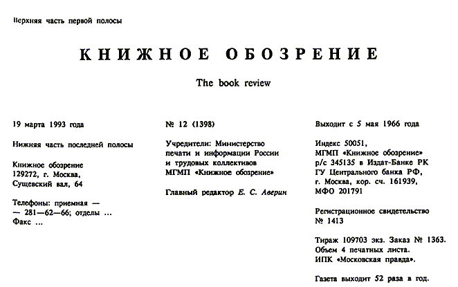 6.3.3 Подзаголовочные данные включают: имя издателя (организации, ответственной за издание); сведения о периодичности выпуска; год, месяц или дату основания газеты; сведения о параллельных изданиях на других языках и приложениях. Не допускается вместо года основания газеты указывать порядковый год ее издания.