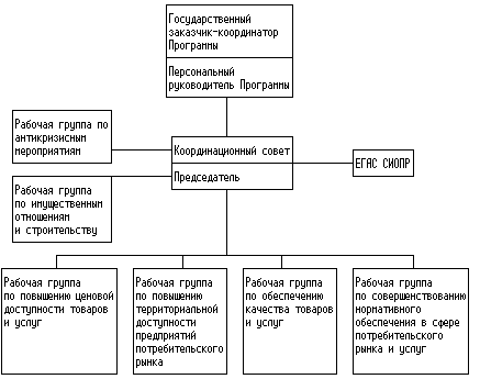 Координационный совет формирует рабочие группы по утвержденным задачам Программы. Для преодоления последствий экономического кризиса на потребительском рынке создается группа по реализации антикризисных мероприятий, в компетенцию которой входят вопросы льготного предоставления торговых и бытовых услуг для малообеспеченных категорий граждан, поддержки социально значимых предприятий потребительского рынка и услуг, сохранения занятости в отрасли.