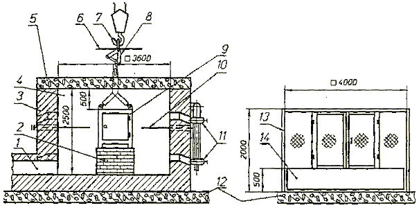 1 - дымовая труба; 2 - опора образца; 3 - кладка печи; 4 - огневая камера; 5 - перекрытие печи; 6 - защитный экран; 7 - подъемно-транспортное устройство; 8 - сбросное устройство; 9 - образец; 10 - термопары печные; 11 - форсунки; 12 - фундамент; 13 - защитное ограждение; 14 - гравийная подушка