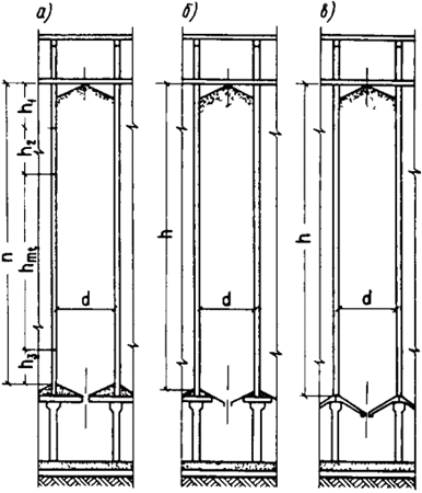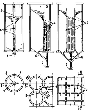 Примечания: 1. Под силосом понимается вертикальная цилиндрическая или призматическая емкость, предназначенная для хранения сыпучего материала. При этом высота от верха воронки или набетонки (забутки) до низа надсилосного перекрытия (черт. 1) должна быть, как правило, более 1,5 (где А - площадь горизонтального сечения силоса).