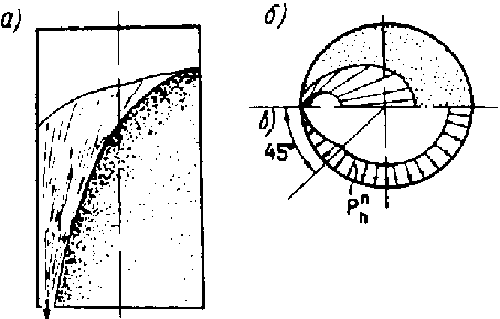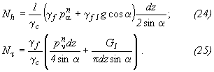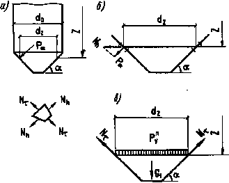 - нормативное давление сыпучего материала на наклонную поверхность днища, нормальное и касательное к поверхности днища:
