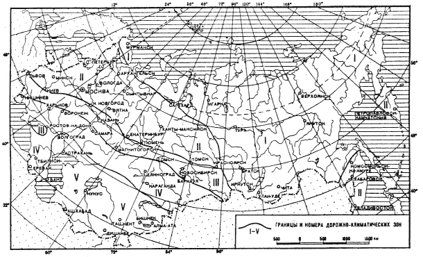 Дорожно-климатические зоны включают в себя следующие географические зоны: I - тундры, лесотундры и северо-восточную часть лесной зоны с распространением вечномерзлых грунтов; II - лесов с избыточным увлажнением грунтов; III - лесостепную со значительным увлажнением грунтов в отдельные годы, IV - степную с недостаточным увлажнением грунтов; V - пустынную и пустынно-степную с засушливым климатом и распространением засоленных грунтов.