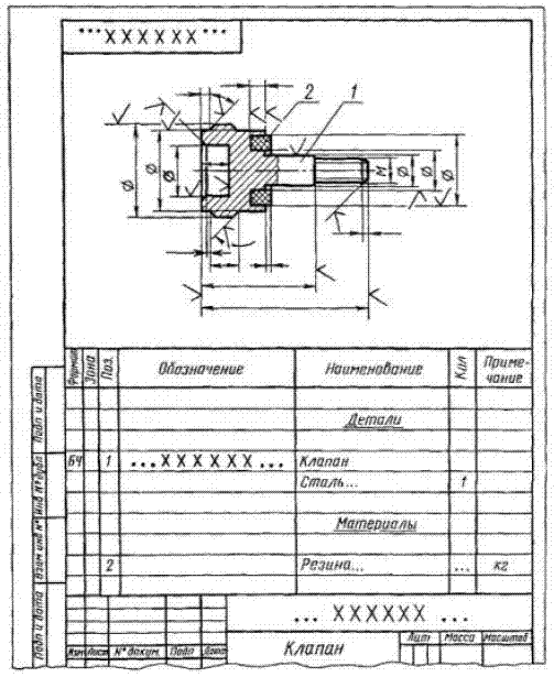 Если нет необходимости устанавливать определенный сортовой материал для детали, то на сборочном чертеже все размеры помещают на изображении этой детали, а в спецификации указывают только марку материала.