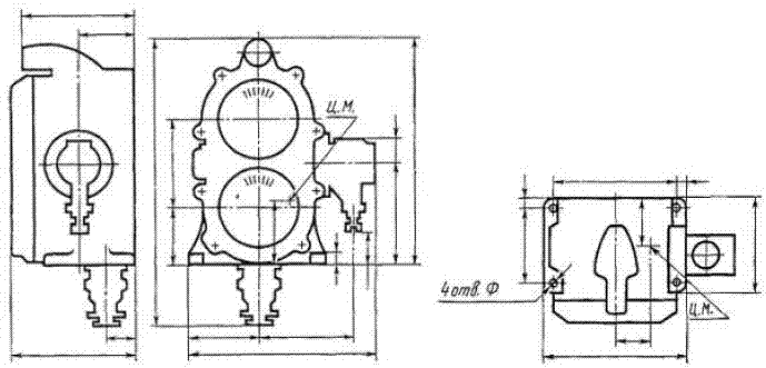 4.3. Количество видов на габаритном чертеже должно быть минимальным, но достаточным для того, чтобы дать исчерпывающее представление о внешних очертаниях изделия, о положениях его выступающих частей (рычагов, маховиков, ручек, кнопок и т.п.), об элементах, которые должны быть постоянно в поле зрения (например, шкалах), о расположении элементов связи изделия с другими изделиями.
