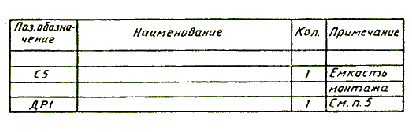 4. Если в изделии имеются элементы, не являющиеся самостоятельными конструкциями, то при записи их в перечень графу "Наименование" не заполняют, а в графе "Примечание" помещают поясняющую надпись или ссылку на поясняющую надпись на поле схемы (черт. 6).