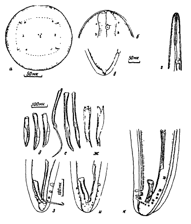 а - головной конец; б - то же латерально; в - хвостовой конец самки, латерально; г - то же, головной конец; д - правые спикулы, вентрально; е - то же, левые спикулы; ж - то же, дистальные концы; з, и, к - хвостовой конец самца, вентрально.