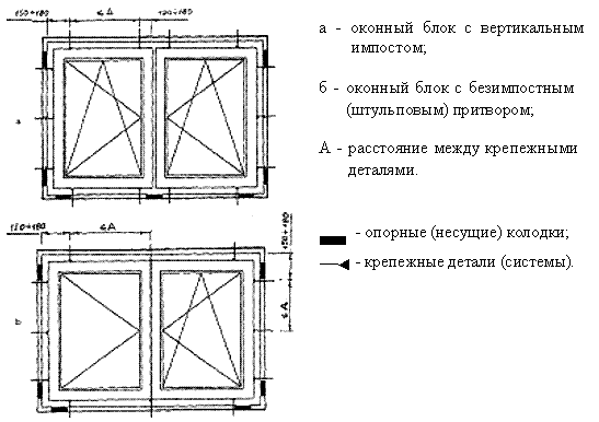 Расстояния от внутреннего угла коробки оконного блока до крепежного элемента - (150-И 80) мм. а расстояние от импостного соединения до крепежного элемента - (120-180) мм.