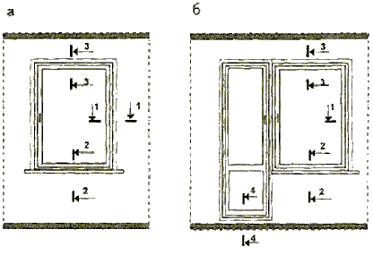 Рис.Г1. Схема расположения сечений для проверки температурного режима узлов примыканий оконных блоков к наружным стенам: а - оконного блока; б - балконной двери