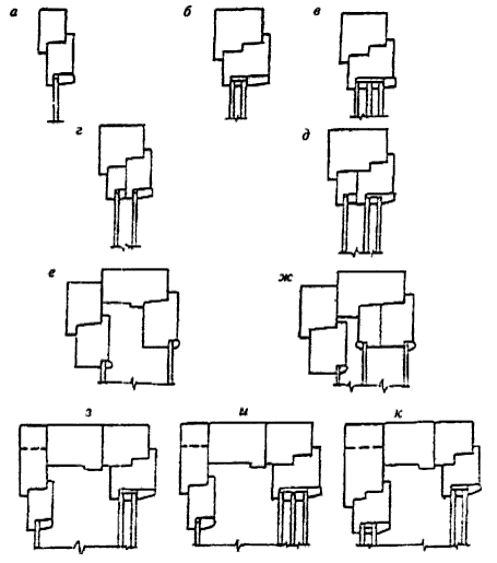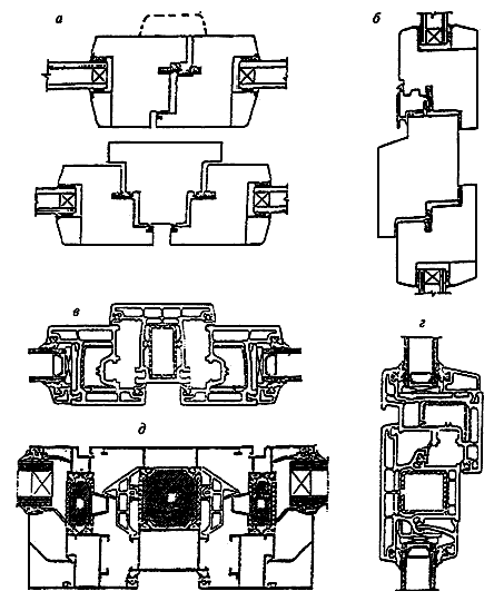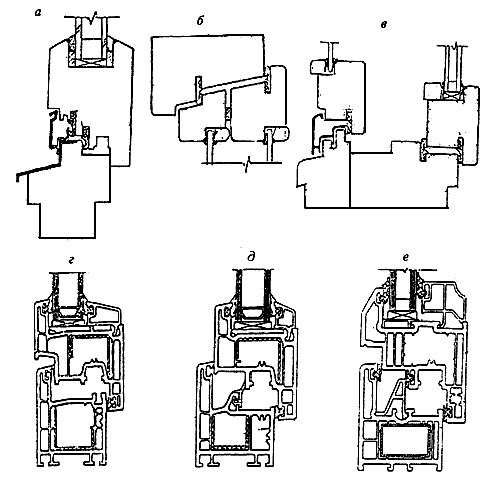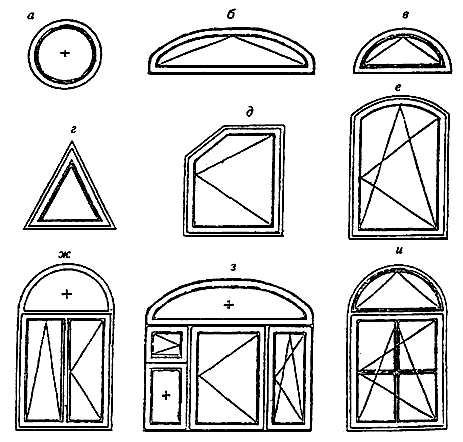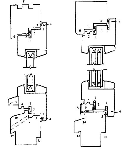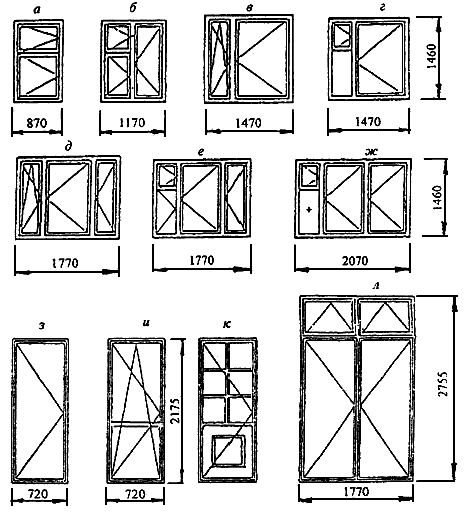 а - одинарный оконный блок с одним стеклом; б - одинарный оконный блок с однокамерным стеклопакетом; в - одинарный оконный блок с двухкамерным стеклопакетом; г - спаренный оконный блок с двойным остеклением; д - спаренный оконный блок со стеклом и стеклопакетом; е - раздельный оконный блок с двойным остеклением; ж - раздельно-спаренный оконный блок с тройным остеклением; з - раздельный оконный блок со стеклом и однокамерным стеклопакетом; и - раздельный оконный блок со стеклом и двухкамерным стеклопакетом; к - раздельный оконный блок с двумя стеклопакетами