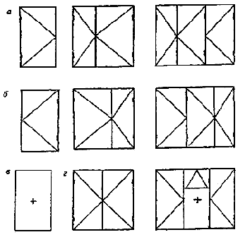 а - оконные блоки левого открывания; б - оконные блоки правого открывания; в - неоткрывающийся оконный блок; г - оконные блоки симметричного открывания