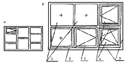 а - пример деревянной оконной рамы для остекления веранды; б - пример металлической рамы с различными видами заполнения конструкции: 1 - стеклопакетами; 2 - неоткрываюшейся створкой (или остекленной коробкой); 3 - открывающейся (распашной) створкой; 4 - оконными блоками; 5 - рама