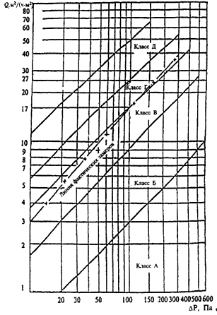 Класс воздухопроницаемости оконного блока определяют по показателю объемной воздухопроницаемости Q, м3 /(ч·м2). В логарифмическом масштабе координат строят нормативные прямые графиков зависимости воздухопроницаемости Q от перепада давления дельта Р, Па, определяющие границы классов воздухопроницаемости. Тангенс угла наклона прямых, соответствующий режиму фильтрации, принимают равным 2/3, базовые точки построения прямых соответствуют значениям воздухопроницаемости Q, равным 3, 9, 17, 27 и 50 м3 /(ч·м2) при значении перепада давления 100 Па. По результатам испытаний оконных блоков, которые проводят по ГОСТ 26602.2, строят линию фактических замеров и по ее расположению определяют класс воздухопроницаемости. Пример определения класса воздухопроницаемости приведен на рисунке Б.1.