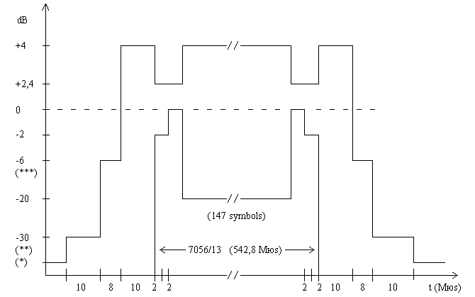 Огибающая излучаемой мощности во времени для нормального пакета при 8-позиционной фазовой модуляции должна находиться в пределах маски, приведенной на рис. 9.2.