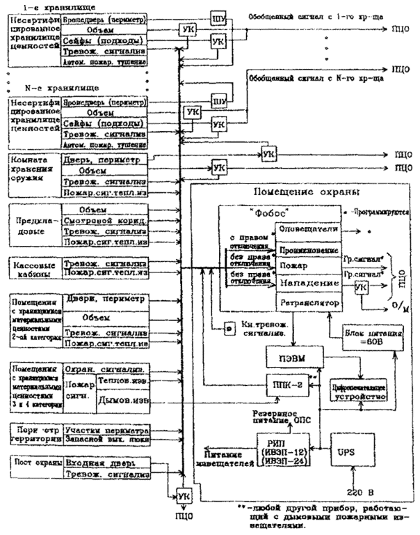 Рис. 3 Примерная структурная схема оборудования объекта, имеющего несколько хранилищ, на базе СПИ "Фобос" по варианту 1