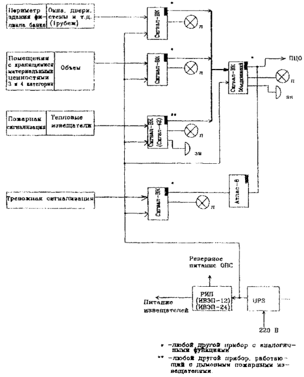 Рис. 9. Примерная структурная схема оборудования объекта средствами ОПТС на базе приемно-контрольного прибора "Сигнал-ВК" и системы уплотнения "Атлас-6" по варианту 7