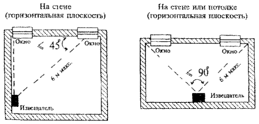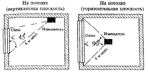 Рис. 2 Варианты установки извещателя охранного поверхностного звукового "Стекло-1" при блокировке остекленных конструкций на "разрушение" стекла