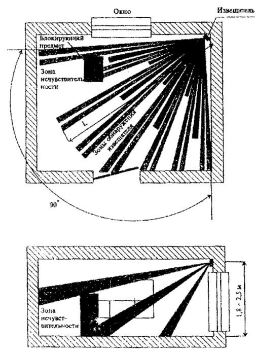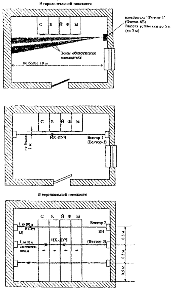 Рис. 14. Блокировка стен, потолка и пола на "проникновение" извещателями активными лилейными оптико-электронными
