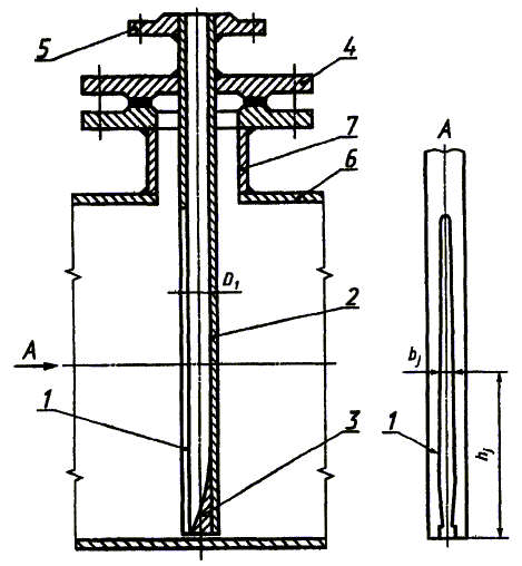 1 - отверстие, 2 - трубка; 3 - стабилизатор; 4 - крышка; 5 - штуцер; 6 - трубопровод; 7 - монтажный патрубок