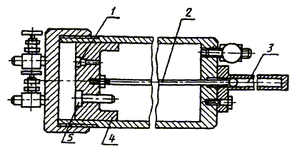 1 - предохранительный клапан; 2 - шток поршня; 3 - указатель положения поршня; 4 - поршень; 5 - перепускное устройство
