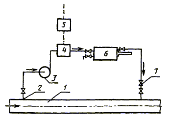 1 - трубопровод; 2 - пробозаборное устройство; 3 - насос; 4 - запорное устройство; 5 - регулятор; 6 - пробоотборник; 7 - обратный клапан