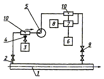 1 - трубопровод; 2 - пробозаборное устройство; 3, 8 - пробозаборники; 4 - кран для ручного отбора проб; 5 - насос; 6 - регуляторы; 7 - запорное устройство; 9 - обратный клапан; 10 - диспергаторы