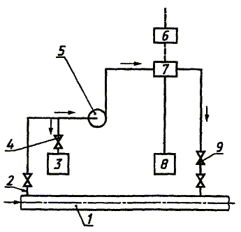 1 - трубопровод; 2 - пробозаборное устройство; 3, 8 - пробосборник; 4 - кран для ручного отбора проб; 5 - насос; 6 - регулятор; 7 - запорное устройство; 9 - обратный клапан