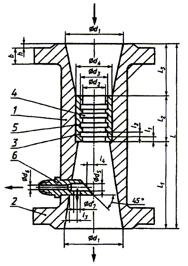 2. При диаметре обводной линии менее 40 мм для монтажа диспергатора на обводной линии устанавливают переходы на диаметр, равный d_1.