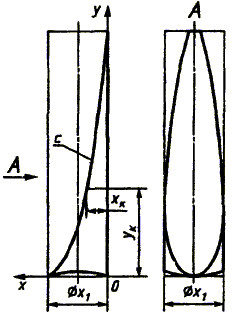 Поверхность С стабилизатора (черт. 20) выполняется по точкам, проекция которых на плоскость О_ху является параболой второй степени с параметрами х_k и у_k (k = 1, ... , 11), мм, определяемыми по формулам: