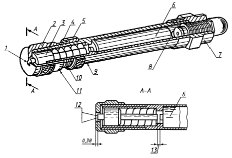 Горелка газовая (черт. 11-14), работающая на бутане или пропане, с регулируемой высотой пламени от 10 до 60 мм. Внутри воздушной камеры трубка горелки должна иметь 4 отверстия для впуска воздуха диаметром 4 мм. Передний край отверстий должен быть приблизительно на одном уровне с кончиком сопла.