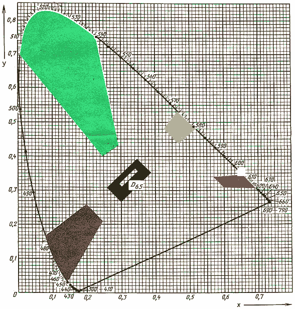 Примечание. Значения, приведенные на цветовом графике и в таблице настоящего приложения, даны для стандартного источника света Д 65 (ГОСТ 7721-76) при освещении поверхности под углом 45° и наблюдении по нормали (геометрии 45°/0°).