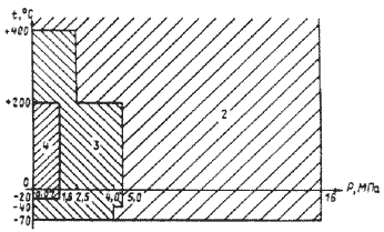 Рис. 1. Деление сосудов на группы в зависимости от расчетного давления (Р) и температуры стенки (Т)