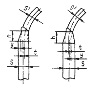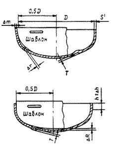 смещение Т нейтральных осей полушаровой части днища и переходной части обечайки корпуса не должно превышать 0,5 (S-S'), где S - толщина обечайки, S' - толщина днища; высота h переходной части обечайки корпуса должна быть не менее 3у (у - расстояние от края днища до края обечайки).