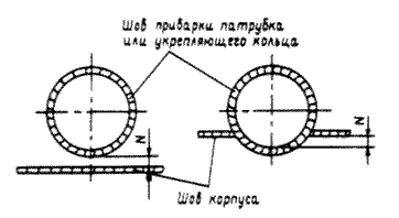 Наименьшее расстояние между меридиональными швами в месте их примыкания к шаровому сегменту или штуцеру, установленному по центру днища вместо шарового сегмента, а также между меридиональными швами и швом на шаровом сегменте должно быть более трехкратной толщины днища, но не менее 100 мм по осям швов.