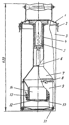 1 - верхняя крышка; 2 - замок; 3 - футляр; 4 - насадка; 5 - нож; 6 - трубка; 7 - поплавок; 8 - крючки; 9 - сосуд; 10 - тарировочный груз; 11 - резиновое кольцо; 12 - нижняя крышка; 13 - замок; 14- режущий цилиндр