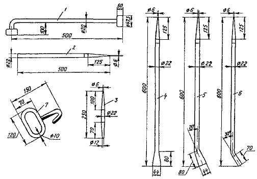 1 - ключ торцовый (2 шт.); 2 - оправка (2 шт.); 3 - оправка (1 шт.); 4 - ломик (1 шт.); 5 - домир (1 шт.); 6 - ломик (1 шт.); 7 - крючки (4 шт.)