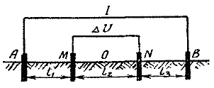 где ДЕЛЬТАU - разность потенциалов, измеряемая между приемными электродами MN, В; I - величина тока, протекающего через цепь питающих электродов АВ, А; k - коэффициент, величина которого определяется по формуле