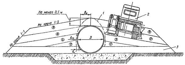 Толщина засыпки над трубой в период строительства должна обеспечивать возможность пропуска строительных машин и механизмов, а также подвижного состава (см. п. 5.82).