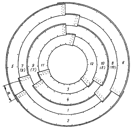 l = 216 см) с вырезом в средней части по радиусу 75 см и стрелкой 8 см; 4 - металлические скобы; 5 - петли из круглой стали диаметром 10 мм