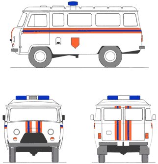 Рисунок А.32. Цветографические схемы автомобилей служб предотвращения и помощи при чрезвычайных ситуациях и гражданской обороны