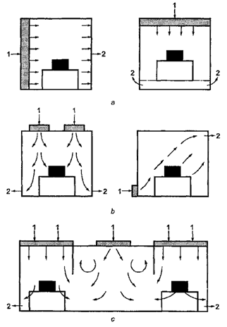 3.6 неоднонаправленный поток воздуха (non-unidirectional airflow): Распределение воздуха, при котором поступающий в чистую зону воздух смешивается с внутренним воздухом посредством подачи струи приточного воздуха.