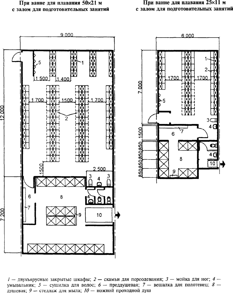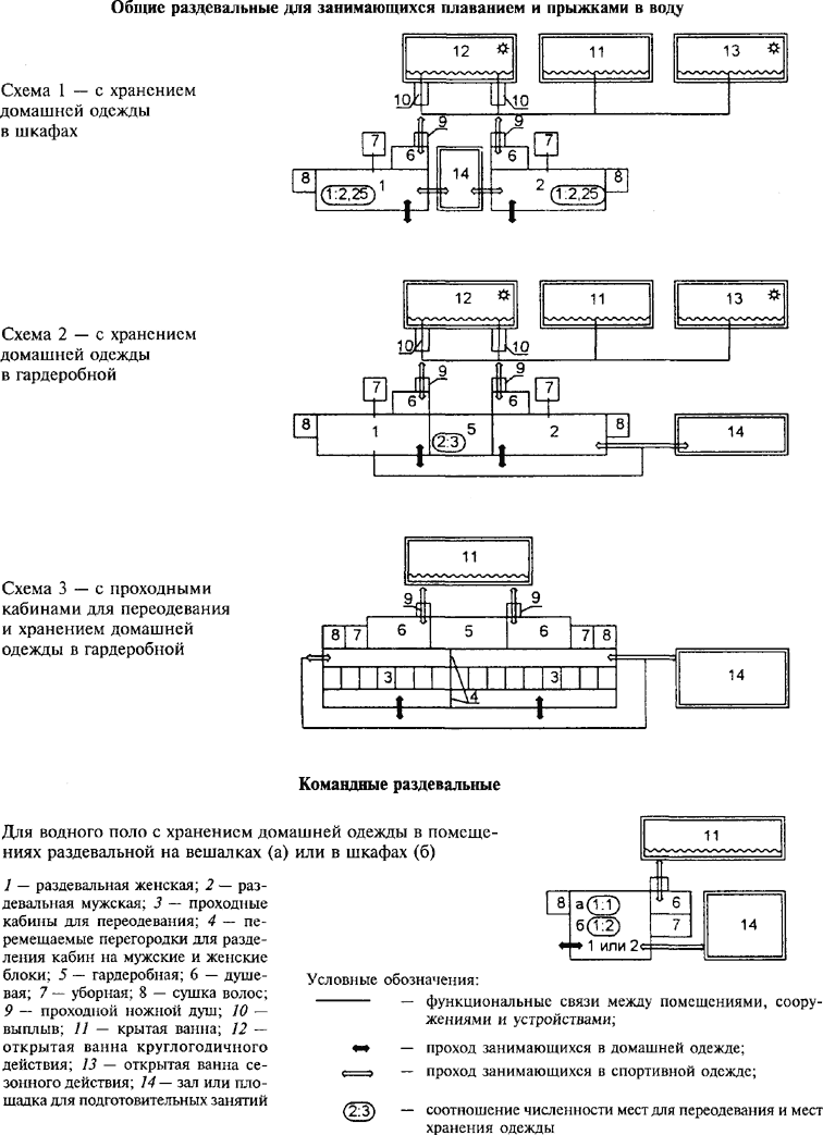 Внутренняя планировка основных помещений бассейна должна соответствовать гигиеническому принципу поточности: продвижение посетителей осуществляется по функциональной схеме - гардероб, раздевальня, душевая, ножная ванна, ванна бассейна. Рекомендуется устраивать в раздевальной проходные кабины для переодевания с двумя входами (выходами), также должно быть предусмотрено, чтобы посетитель не мог пройти к ванне, минуя душевую.