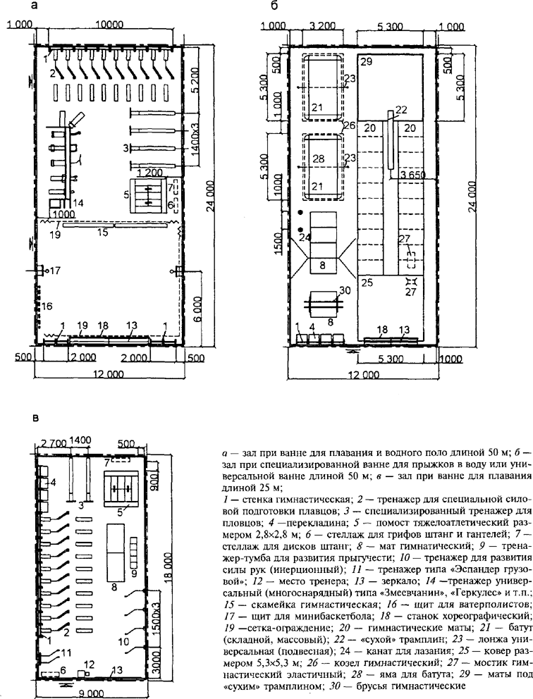 1.6 Положения Свода правил распространяются на проектирование залов со специально предусмотренными для размещения в них различными ваннами бассейнов, которые могут размещаться как в отдельно стоящих зданиях и в спортивных комплексах, так и при встраивании их в другие сооружения.