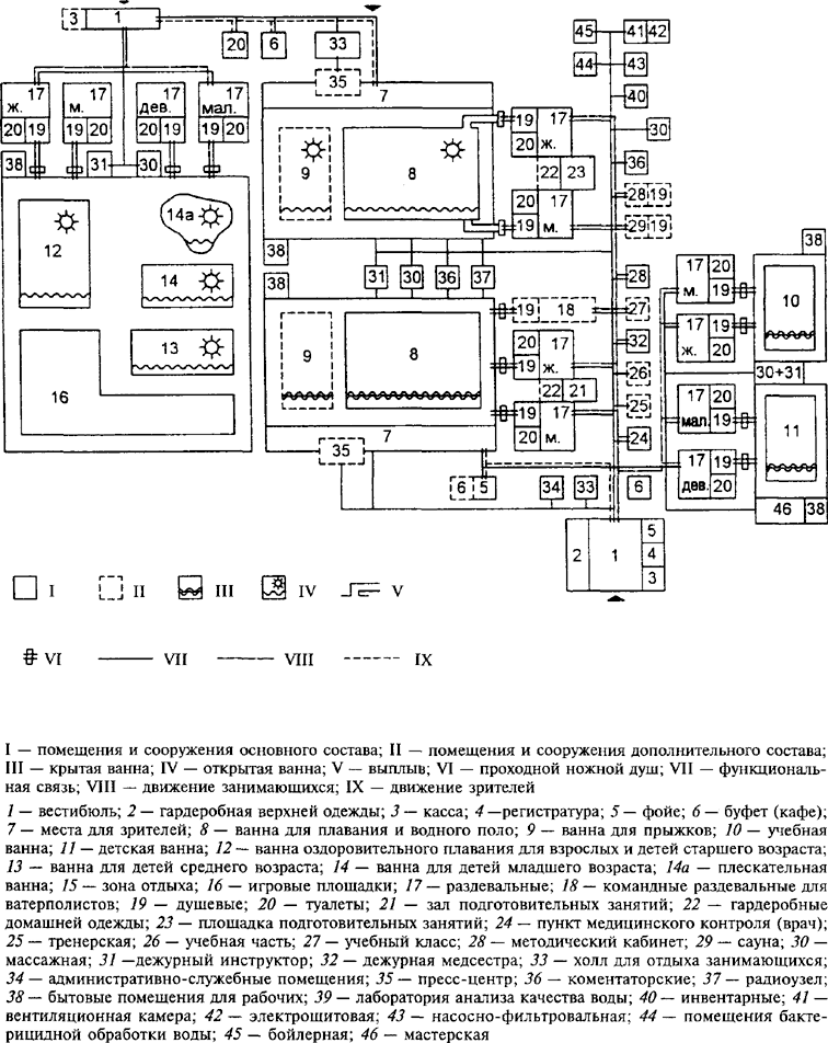 3.2 Функционально сооружение бассейна объединяет одну или несколько ванн, помещения и устройства для обслуживания занимающихся, зрителей (преимущественно в универсальных и демонстрационных бассейнах), а также помещения с устройствами, обеспечивающими его техническую эксплуатацию.