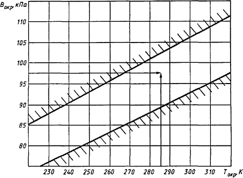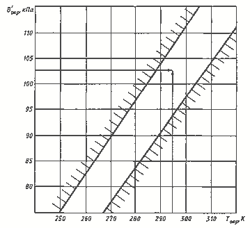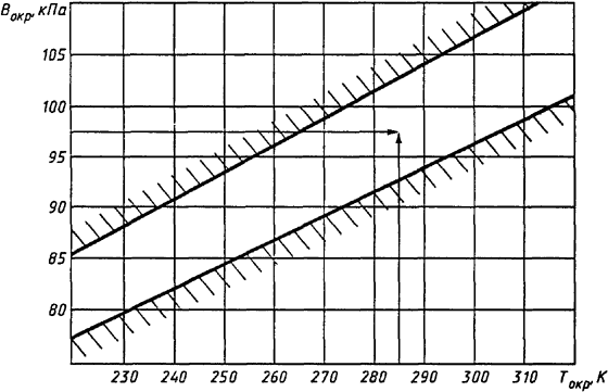 Б.1. Выбросы определяют, если точка, соответствующая измеренным во время испытаний значениям атмосферного давления и температуры окружающего воздуха, находится внутри обозначенного на номограмме поля или на его границах.