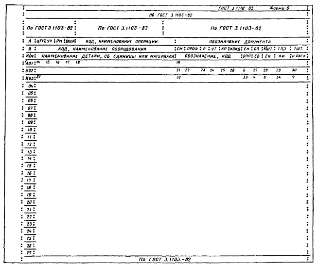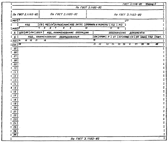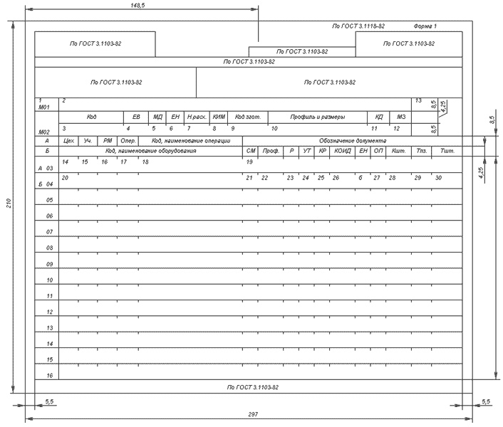 | Единичные технологические процессы, выполняемые с применением различных методов обработки | 1 | Первый или заглавный лист | Все методы | При автоматизированной распечатке форм на АЦПУ размеры высоты граф следует увеличить до 8,5 мм за счет уменьшения количества основных строк, предназначенных для описания операций (см. форму 5) |