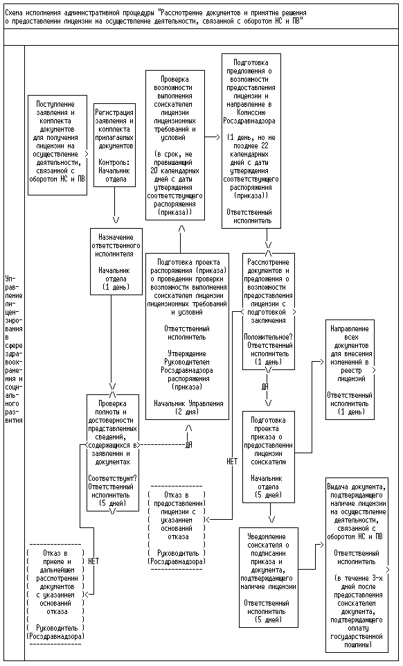 1) рассмотрение документов и принятие решения о предоставлении лицензии на осуществление деятельности, связанной с оборотом наркотических средств и психотропных веществ. Основание - статья 9 Федерального закона от 08.08.2001 N 128-ФЗ "О лицензировании отдельных видов деятельности"; пункт 9 Постановления Правительства Российской Федерации от 04.11.2006 N 648 "Об утверждении положений о лицензировании деятельности, связанной с оборотом наркотических средств и психотропных веществ";