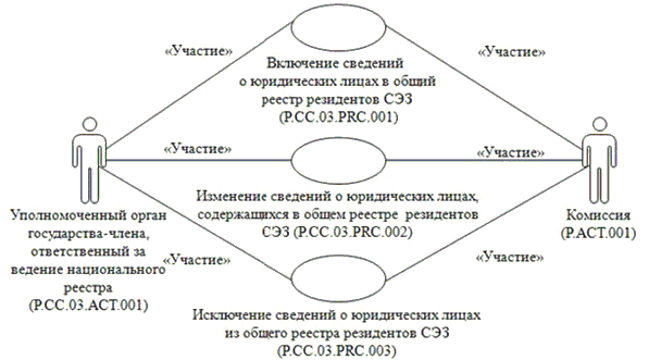 При включении сведений о юридических лицах в национальный реестр выполняется процедура "Включение сведений о юридических лицах в общий реестр резидентов СЭЗ" (P.CC.03.PRC.001).