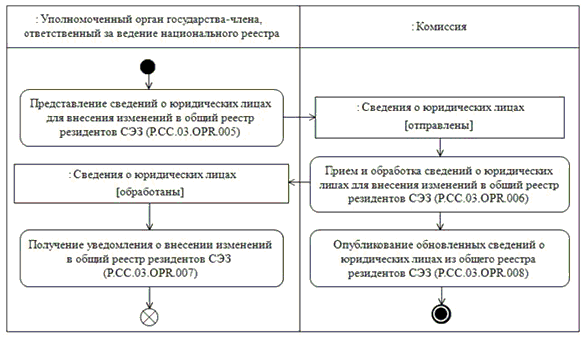 В случае если в процессе внесения изменений в национальный реестр изменяется регистрационный номер документа, подтверждающего включение сведений о юридических лицах в национальный реестр, то представление сведений о юридических лицах осуществляется с использованием 2 процедур: "Исключение сведений о юридических лицах из общего реестра резидентов СЭЗ" (P.CC.03.PRC.003) и "Включение сведений о юридических лицах в общий реестр резидентов СЭЗ" (P.CC.03.PRC.001).