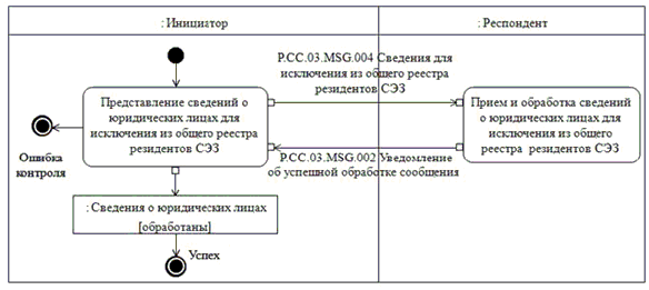 При исключении сведений о юридических лицах из национального реестра выполняется процедура "Исключение сведений о юридических лицах из общего реестра резидентов СЭЗ" (P.CC.03.PRC.003).